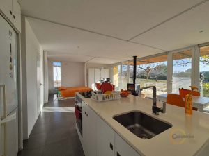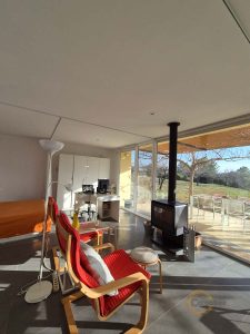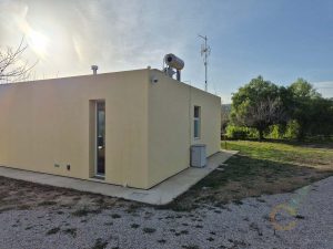 Additional features include a wood-burning stove, aluminium exterior joinery, porcelain stoneware flooring, and a modern, design-led interior style. The property is connected to mains drinking water and solar-powered electricity.